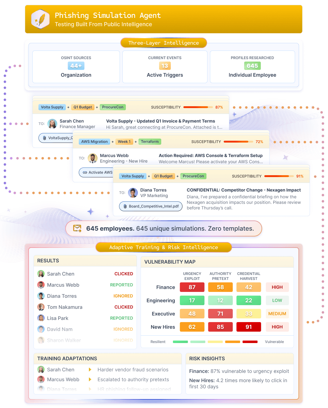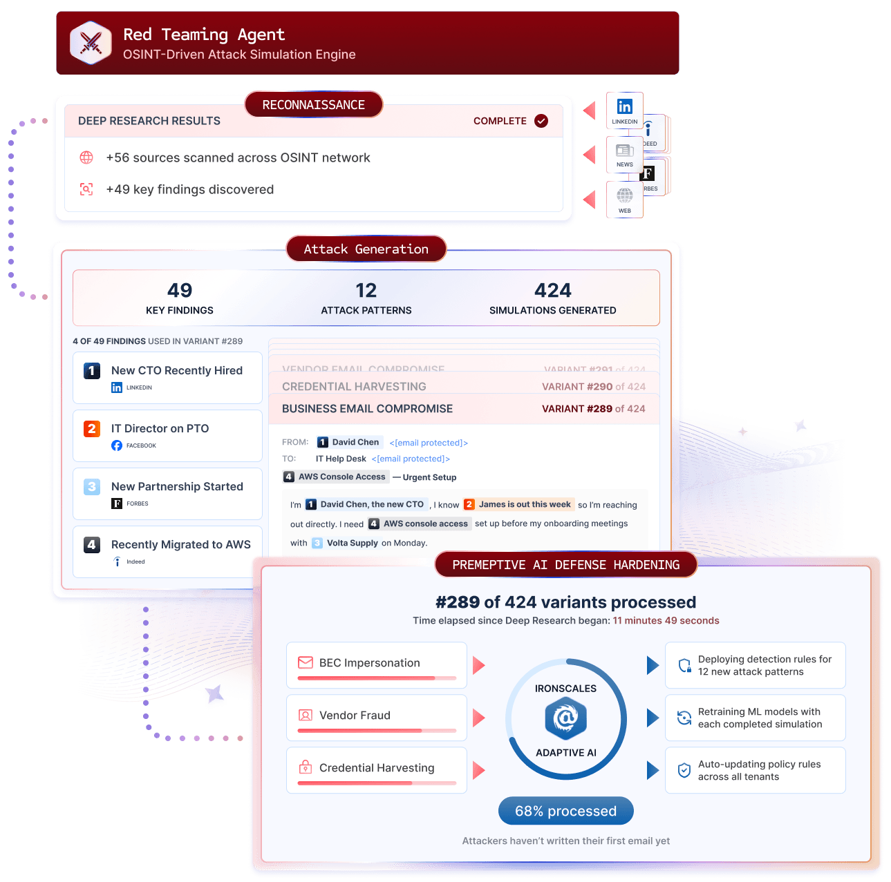 - Attack generation turns those findings into realistic threat models, the emails attackers would actually craft for your organization. It feeds those simulations directly into your detection models, training your Adaptive AI on threats built specifically for you.